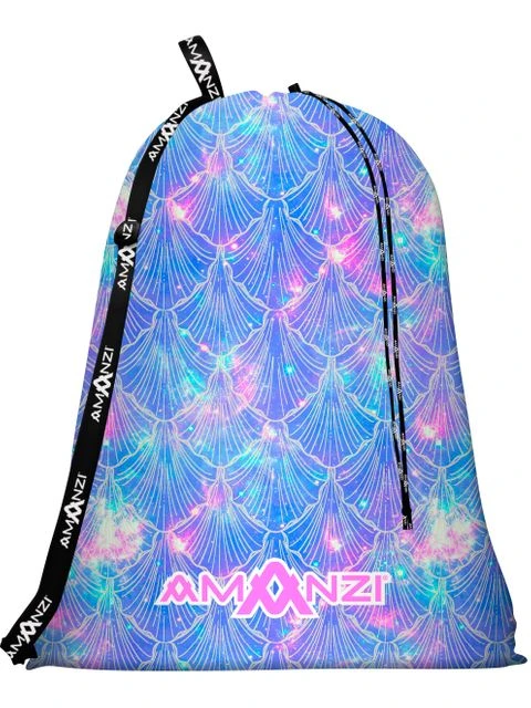 The sparkling AMANZI Mermaid Kisses Mesh Bag features a gorgeous cerulean print with sparkling galaxies in pretty pastel pink, emerald, amethyst, and topaz. With a magnolia white seashell pattern over the top, this one piece is easily one of the prettiest prints of the season.