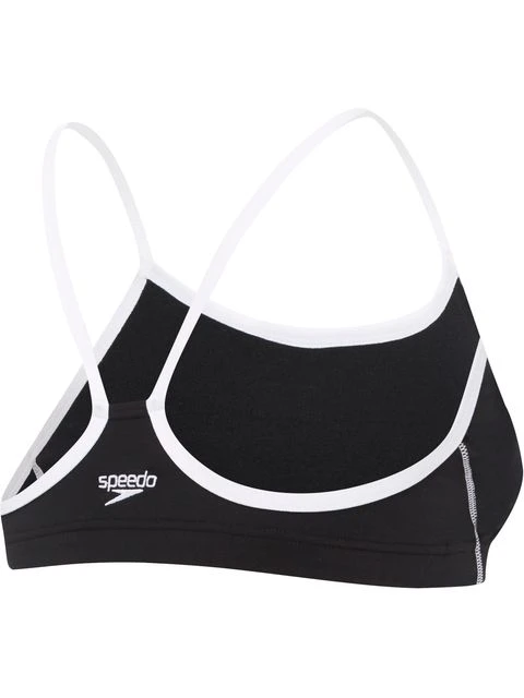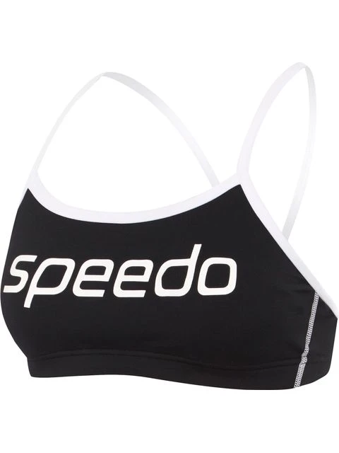 The Speedo Endurance+ Crop Top – Black/White is a sporty timeless design. It has a solid black with a white plastisol Speedo logo print across the chest and white constrast straps. This bikini top can be mixed or matched to a range of Speedo bikini bottoms.