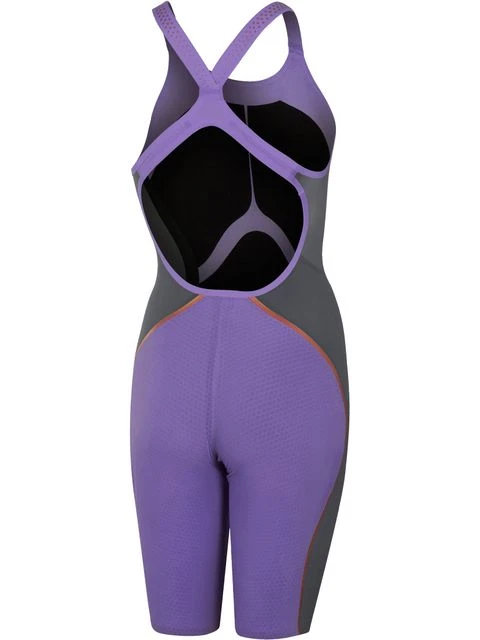 Feel unstoppable wearing the Speedo Fastskin LZR Pure Intent Openback Kneeskin – Purple Reign. Developed by swimmers for swimmers, the Fastskin LZR Pure Intent ‘Purple Reign’ Openback Kneeskin in Miami Lilac & USA Charcoal features compressive dual layers and ergonomic seam construction designed to connect key muscle groups for greater power return. Textured fabric zones target drag reduction so you get the very best from your swim, and the triple fabric construction with bonded seams has been designed to enable greater movement. The open back offers greater freedom of movement and may be preferred by swimmers with arched backs. This product has been fully approved by FINA.