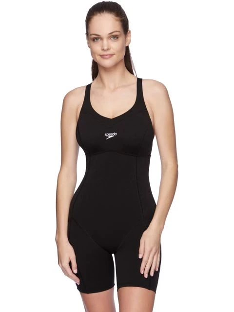 The Speedo Hydralift Legsuit – Black has wide adjustable straps, a medium neck and back cut and inner D/DD bust capacity to offer bust support and uplift. This legsuit provides extra coverage and support so that you can take your fitness class or training session in comfort and confidence. The thigh length suit is solid black with an embroidered Speedo logo on the chest as well as the Endurance+ logo on the back of the leg.