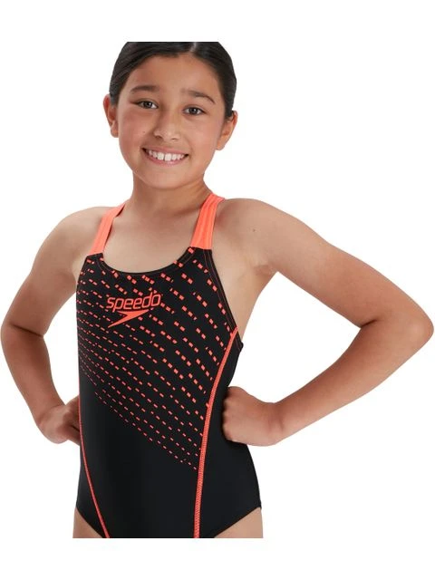 The Speedo Medalist One Piece – Medley Logo/Aquarium is everything your child needs for a great swim. The Speedo black Medley Medalist swimsuit features an eye-catching orange kinetic wave print alongside colour-pop seams and straps. The medalist design is a Speedo classic and aids shoulder movement and flexibility so that young swimmers can cruise through the water without feeling restricted. Ideal for regular pool sessions, the suit is lined at the front and back for comfort and modesty. Speedo ECO EnduraFlex fabric offers higher chlorine resistance than standard swimwear fabrics and fits like new for longer with CREORA HighClo. Made from 100% recycled waste fabric, so it’s better for the environment too!